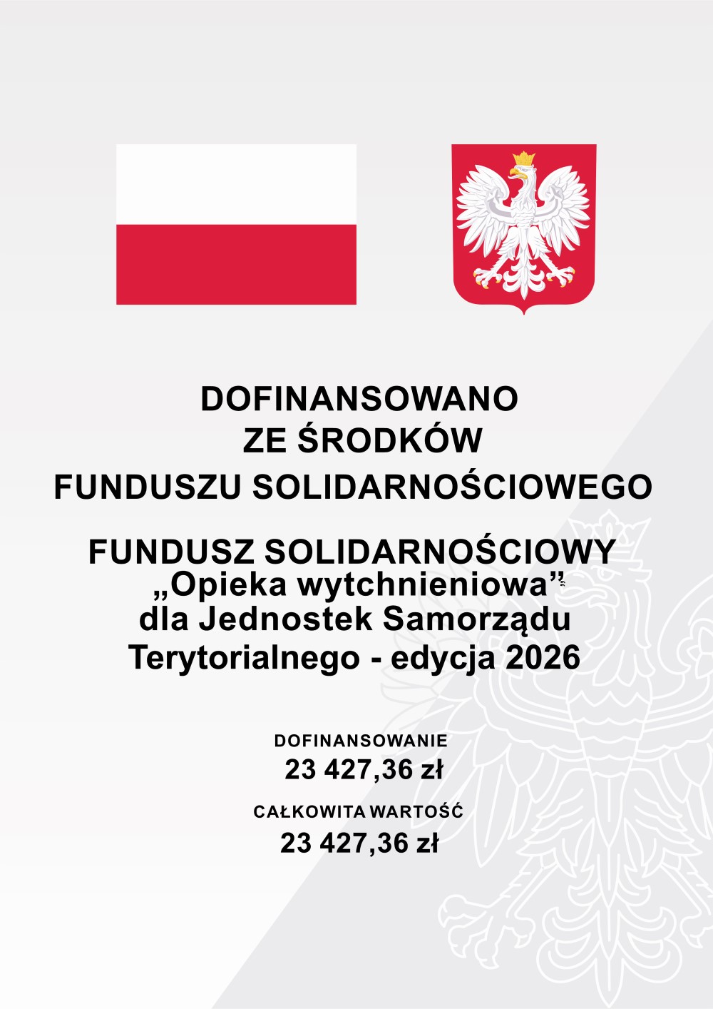 Plakat informacyjny - dofinansowano ze środków Funduszu Solidarnościowego w ramach Programu "Opieka wytchnieniowa" dla Jednostek Samorządu Terytorialnego - edycja 2026, dofinansowanie 23 427,36 złotych, całkowita wartość 23 427,36 złotych.