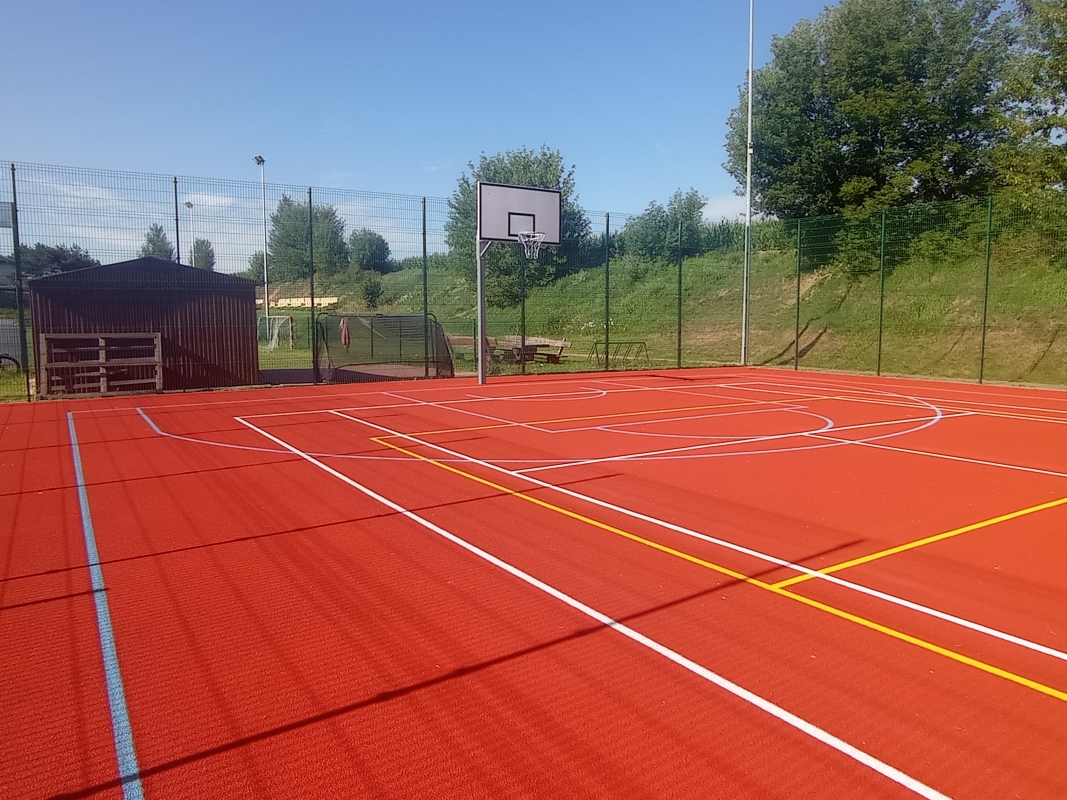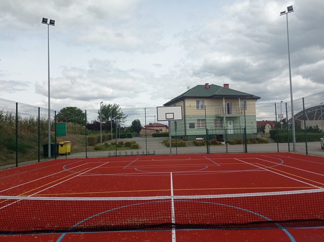 1) Modernizację boiska wielofunkcyjnego o wymiarach 32,10 m x 19,10 m, na którym znajduje się boisko do siatkówki, boisko do piłki koszykowej oraz boisko do tenisa, poprzez: